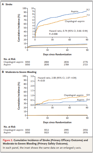O estudo INSPIRES mostrou no seu desfecho primário, a presença de um novo acidente vascular cerebral em 90 dias, em 222 pacientes (7,3%) no grupo Clopidogrel/Aspirina e em 279 pacientes (9,2%) no grupo Placebo/Aspirina (taxa de risco marginal estimada, 0,79; intervalo de confiança de 95% [IC], 0,66 a 0,94; p = 0,008). Então, o que isso quer dizer?